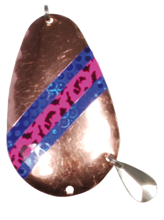 Jemtlandsin Twin -rautupilkki, pituus:60mm, väri:Kupari/Tumman sinisillä ja pinkeillä -raidoilla ja pienellä hopean värisellä houkutin-lipalla.